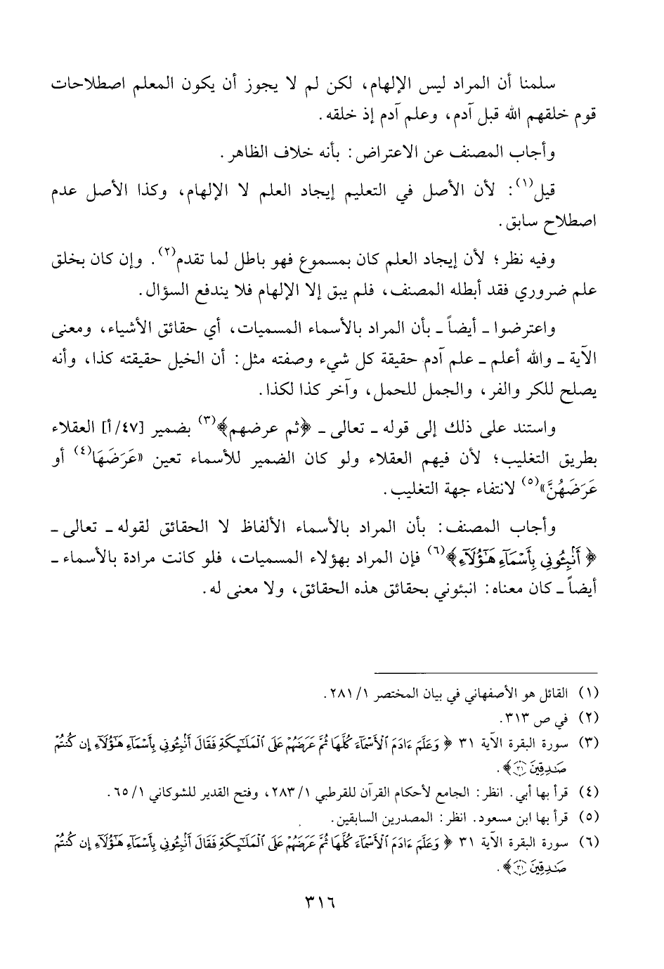 واعترضوا -أيضا- بأن المراد بالأسماء المسميات، أي حقائق الأشياء، ومعنى الآية -والله أعلم- علم آدم حقيقة كل شيء وصفته مثل: أن الخيل حقيقته كذا، وأنه يصلح للكر والفر، والجمل للحمل، وآخر كذا لكذا.
