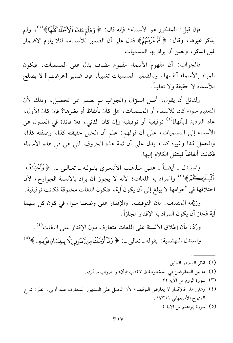 واستدل -أيضا- على مذهب الأشعري بقوله -تعالى-: (وَاخْتِلَافُ أَلْسِنَتِكُمْ) والمراد به اللغات؛ لأنه لا يجوز أن يراد بالألسنة الجوارح، لأن اختلافها في أجرامها لا يبلغ إلى أن يكون آية، فتكون اللغات مخلوقة فكانت توقيفية.
