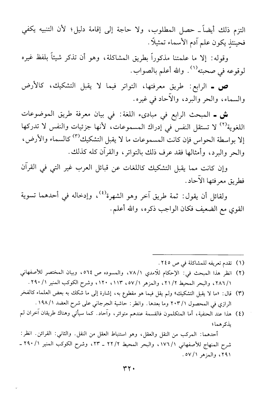 ش- المبحث الرابع في مبادئ اللغة: في بيان معرفة طريق الموضوعات اللغوية لا تستقل النفس في إدراك المسموعات، لأنها جزئيات والنفس لا تدركها إلا بواسطة الحواس فإن كانت المسموعات ما لا يقبل التشكيك كالسماء والأرض، والحر والبرد، وأمثالها فقد عرف ذلك بالتواتر، والقرآن كله كذلك.