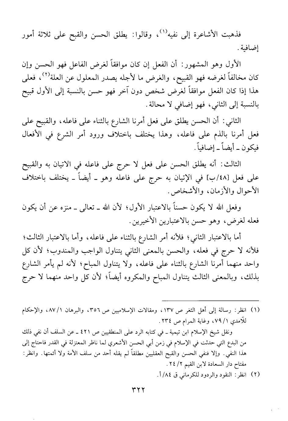 الثالث: أنه يطلق الحسن على فعل لا حرج على فاعله في الاتيان به والقبيح على فعل [٤٨/ب] في الإتيان به حرج على فاعله وهو -أيضا- يختلف باختلاف الأحوال والأزمان, والأشخاص.