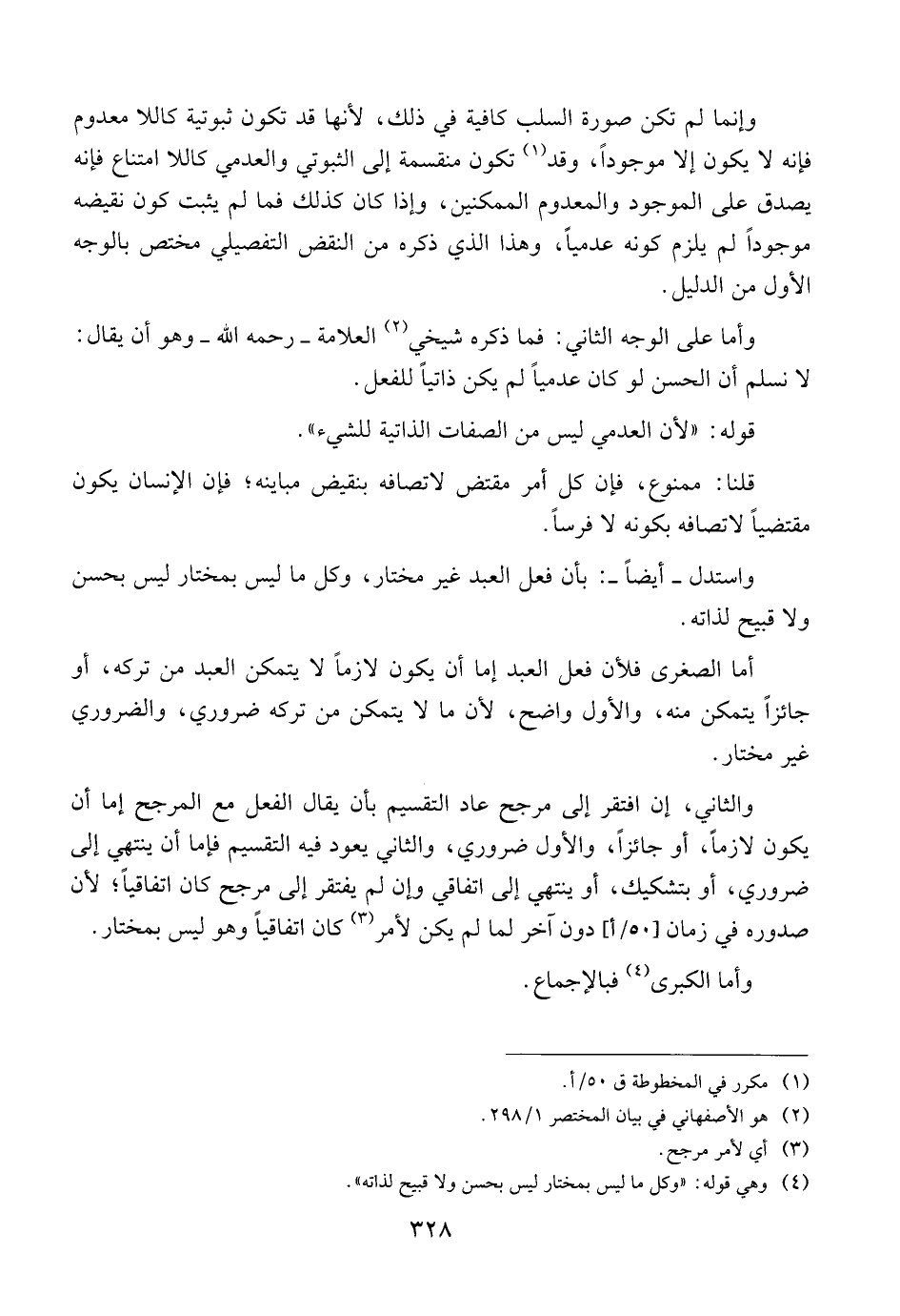 والثاني, إن افتقر إلى مرجح عاد التقسيم بأن يقال الفعل مع المرجح إما أن يكون لازما, أو جائزا, والأول ضروري, والثاني يعود فيه التقسيم فإما أن ينتهي إلى ضروري, أو بتشكيك, أو ينتهي إلى اتفاقي وإن لم يفتقر إلى مرجح كان اتفاقيا, لأن صدوره في زمان [٥٠/أ] دون آخر لما لم يكن الأمر كان اتفاقيا وهو ليس بمختار.
