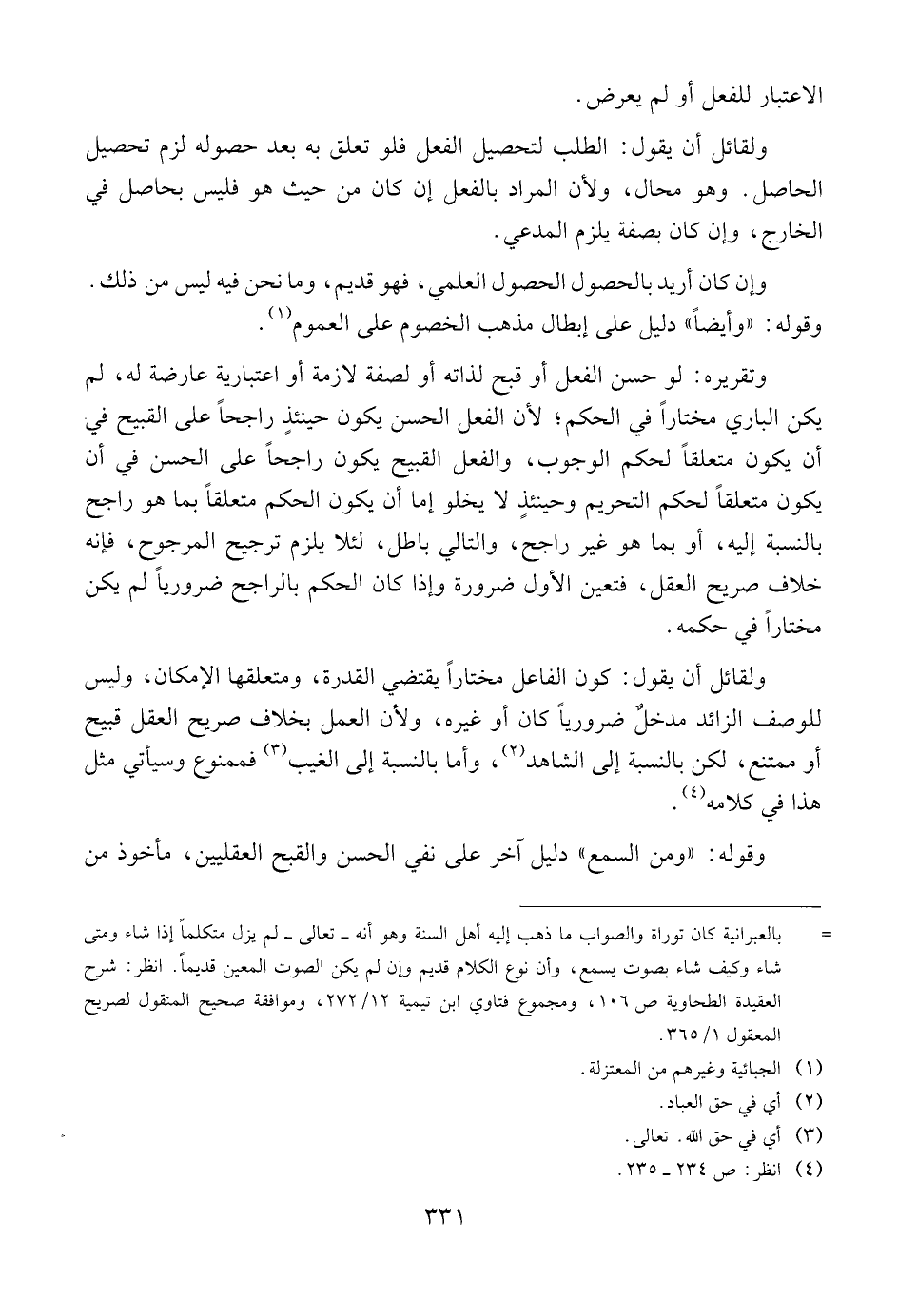 وتقريره: لو حسن الفعل أو قبح لذاته أو لصفة لازمة أو اعتبارية عارضة له, لم يكن الباري مختارا في الحكم؛ لأن الفعل الحسن يكون حينئذ راجحا على القبيح في أن يكون متعلقا لحكم الوجوب, والفعل القبيح يكون راجحا على الحسن في أن يكون متعلقا لحكم التحريم وحينئذ لا يخلو إما أن يكون الحكم متعلقا بما هو راجح بالنسبة إليه, أو بما هو غير راجح, والتالي باطل, لئلا يلزم ترجيح المرجوح, فإنه خلاف صريح العقل, فتعين الأول ضرورة وإذا كان الحكم بالراجح ضروريا لم يكن مختارا في حكمه.