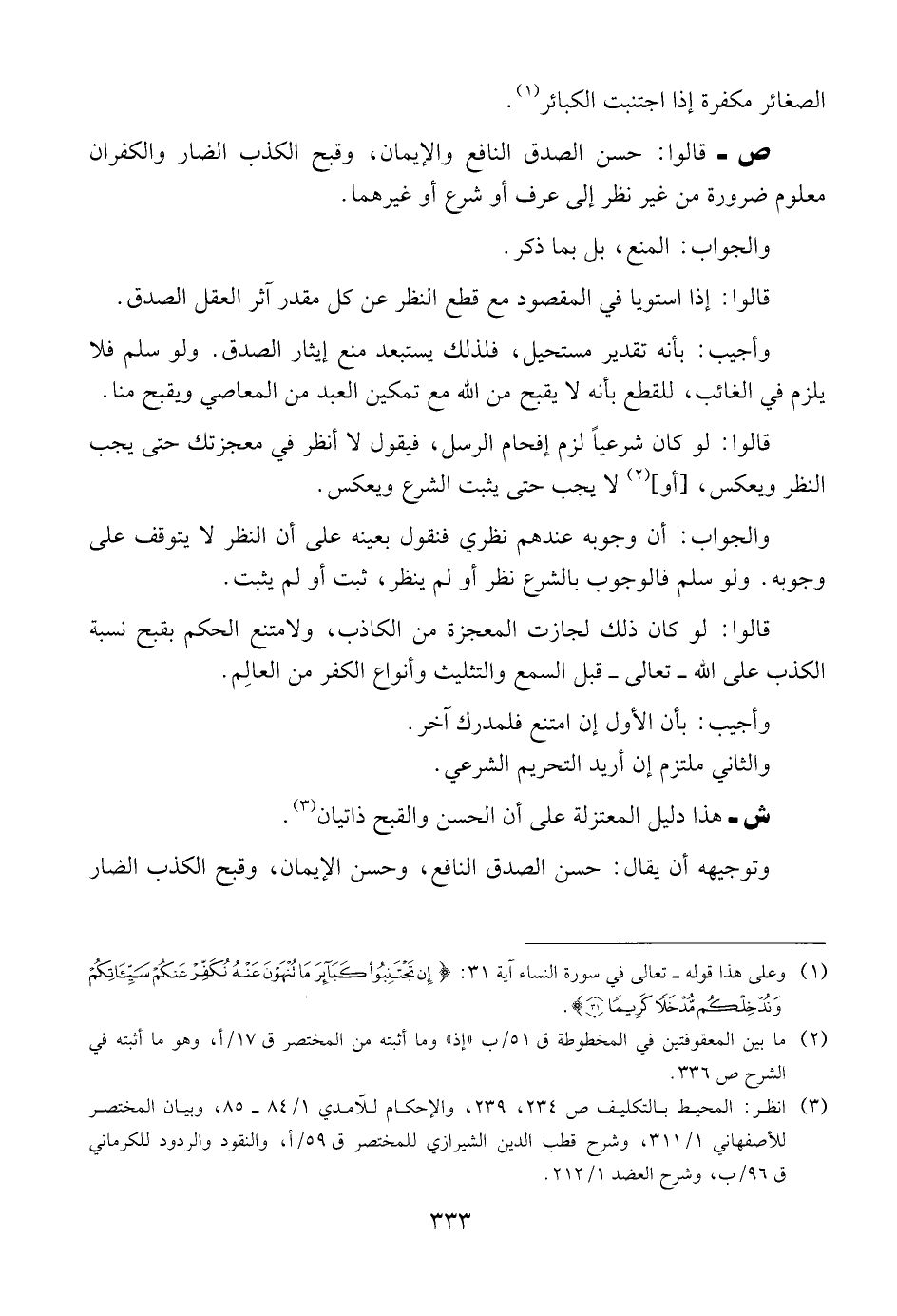 ص- قالوا: حسن الصدق النافع والإيمان, وقبح الكذب الضار والكفران معلوم ضرورة من غير نظر إلى عرف أو شرع أو غيرهما.