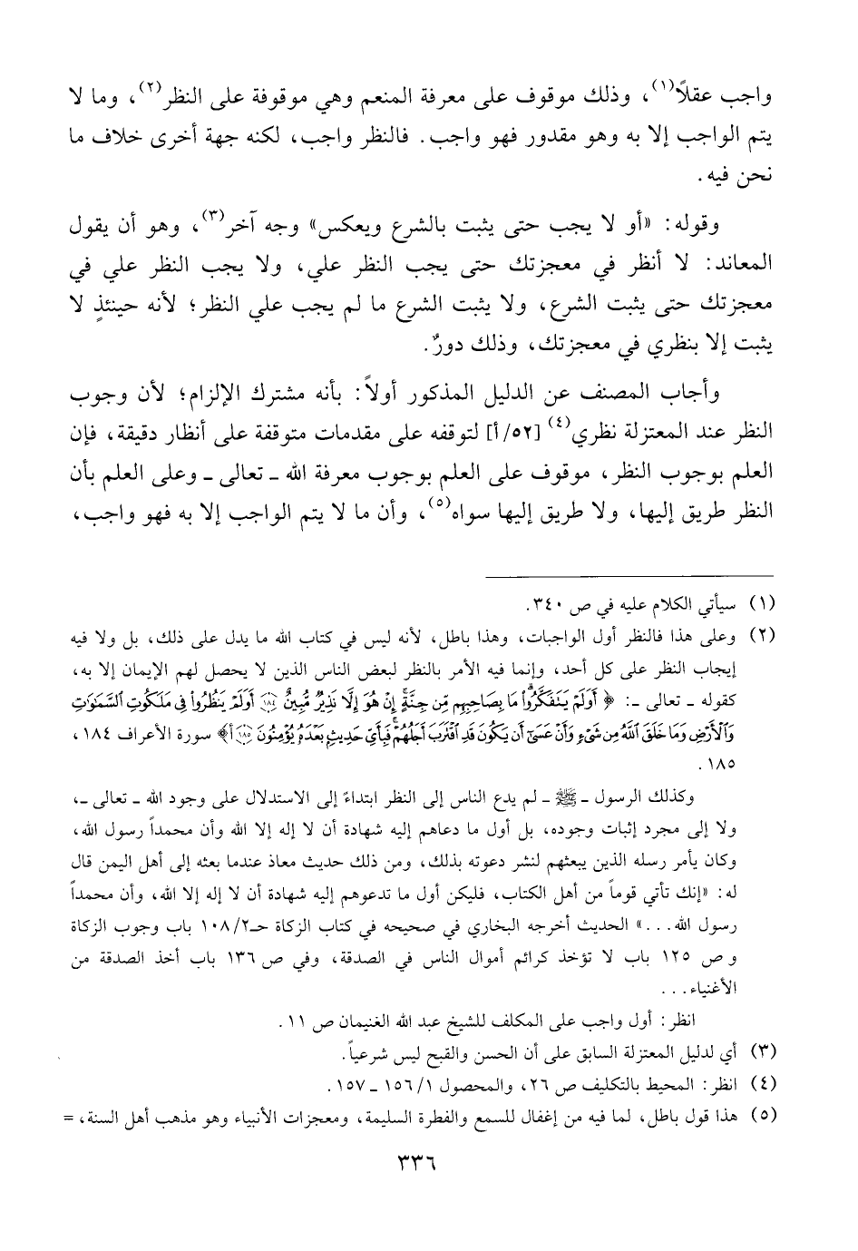 وأجاب المصنف عن الدليل المذكور أولا: بأنه مشترك الإلزام؛ لأن وجوب النظر عند المعتزلة نظري [٥٢/أ] لتوقفه على مقدمات متوقفة على أنظار دقيقة, فإن العلم بوجوب النظر, موقوف على العلم بوجوب معرفة الله -تعالى- وعلى العلم بأن النظر طريق إليها, ولا طريق إليها سواه, وأن ما لا يتم الواجب إلا به فهو واجب,