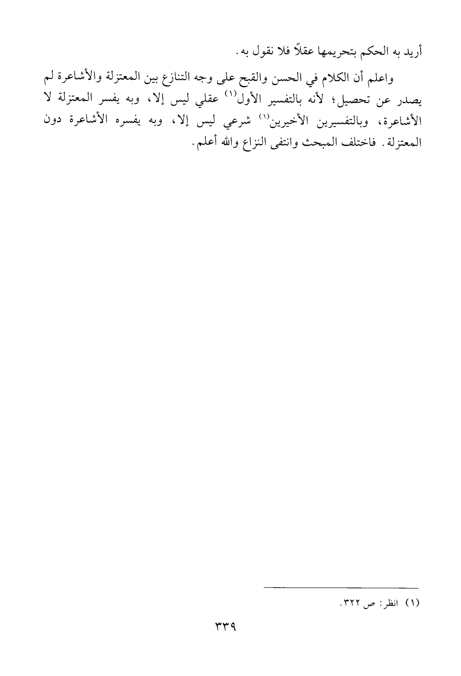 واعلم أن الكلام في الحسن والقبح على وجه التنازع بين المعتزلة والأشاعرة لم يصدر عن تحصيل, لأنه بالتفسير الأول عقلي ليس إلا، وبه يفسر المعتزلة لا الأشاعرة, وبالتفسيرين الأخيرين شرعي ليس إلا, وبه يفسره الأشاعرة دون المعتزلة. فاختلف المبحث وانتفى النزاع والله أعلم.
