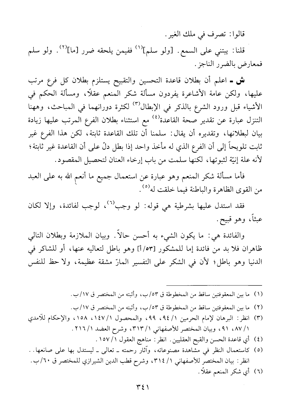 ش ــ اعلم أن بطلان قاعدة التحسين والتقبيح يستلزم بطلان كل فرع مرتب عليها، ولكن عامة الأشاعرة يفردون مسألة شكر المنعم عقلاً، ومسألة الحكم في الأشياء قبل ورود الشرع بالذكر في الإبطال لكثرة دورانهما في المباحث، وههنا التنزل عبارة عن تقدير صحة القاعدة مع استثناء بطلان الفرع المرتب عليها زيادة بيان لبطلانها، وتقديره أن يقال: سلمنا أن تلك القاعدة ثابتة، لكن هذا الفرع غير ثابت تلويحاً إلى أن الفرع الذي له مأخذ واحد إذا بطل دلّ على أن القاعدة غير ثابتة؛ لأنه علة إنيّة لثبوتها، لكنها سلمت من باب إرخاء العنان لتحصيل المقصود.