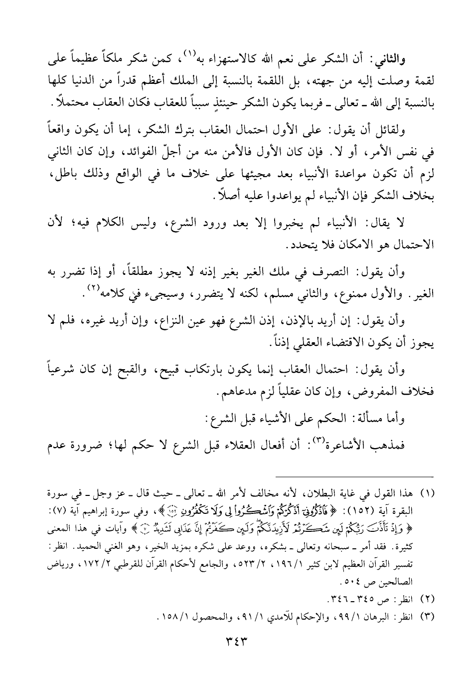 ولقائل أن يقول: على الأول احتمال العقاب بترك الشكر، إما أن يكون واقعاً في نفس الأمر، أو لا. فإن كان الأول فالأمن منه من أجلّ الفوائد، وإن كان الثاني لزم أن تكون مواعدة الأنبياء بعد مجيئها على خلاف ما في الواقع وذلك باطل، بخلاف الشكر فإن الأنبياء لم يواعدوا عليه أصلاً.