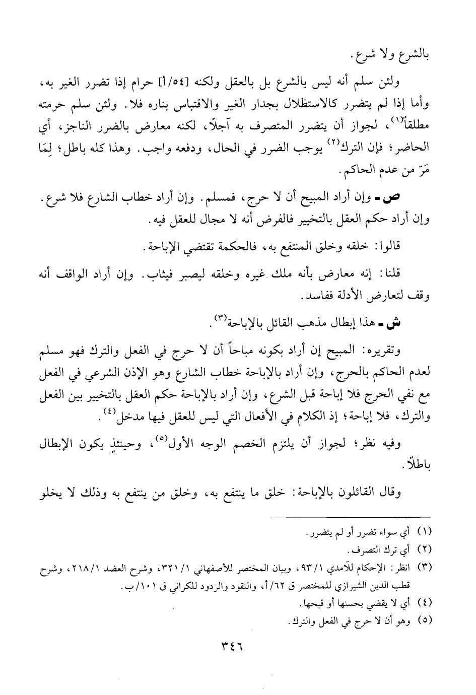 ص ــ وإن أراد المبيح أن لا حرج، فمسلم. وإن أراد خطاب الشارع فلا شرع. وإن أراد حكم العقل بالتخيير فالفرض أنه لا مجال للعقل فيه.