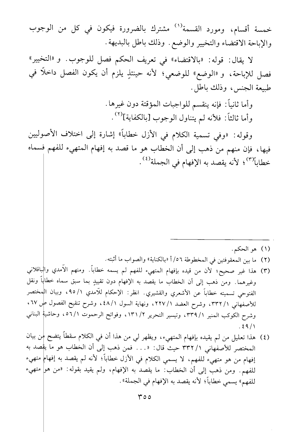 وقوله: {{وفي تسمية الكلام في الأزل خطاباً}} إشارة إلى اختلاف الأصوليين فيها، فإن منهم من ذهب إلى أن الخطاب هو ما قصد به إفهام المتهيء للفهم فسماه خطاباً؛ لأنه يقصد به الإفهام في الجملة.