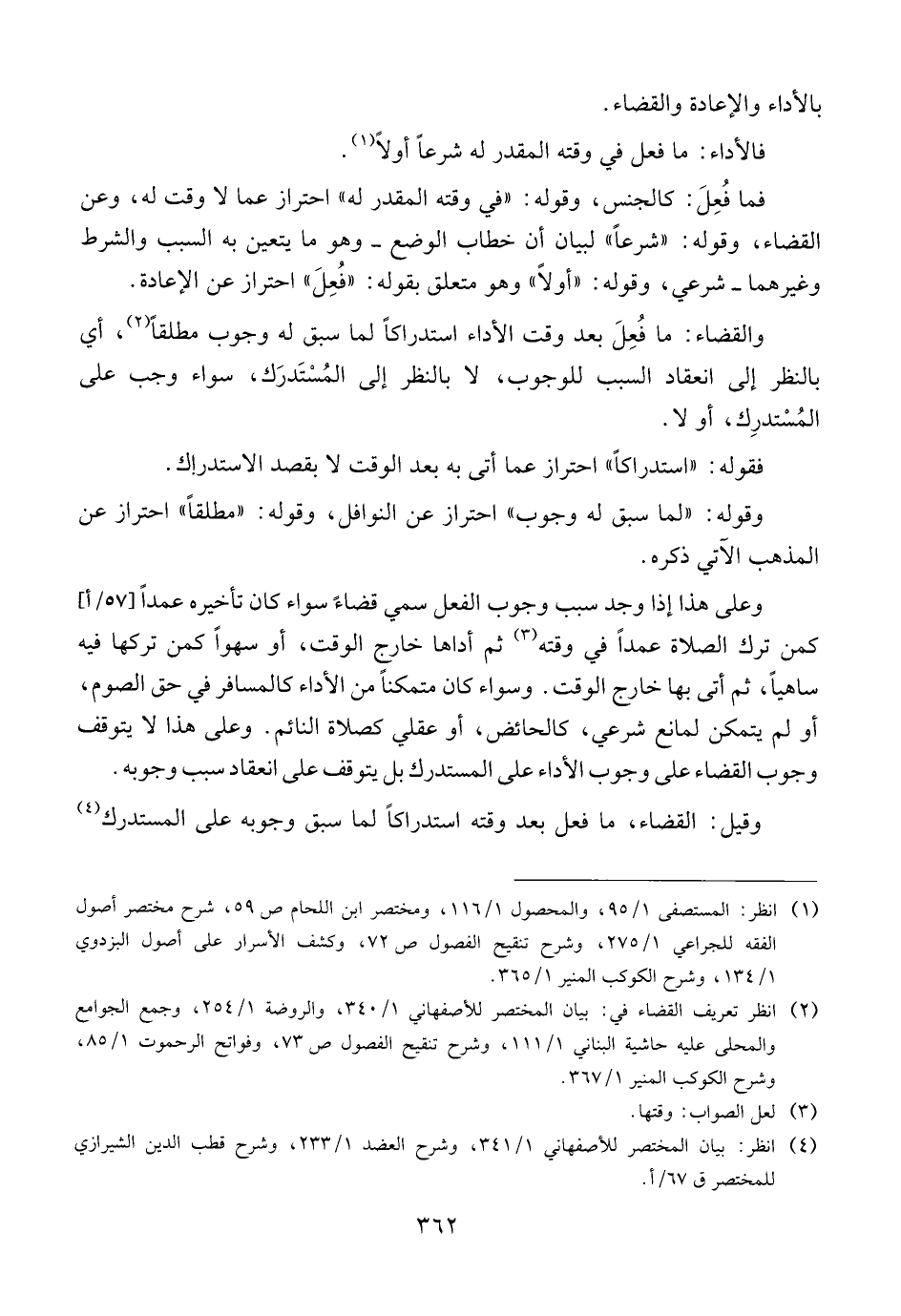 فما فُعِلَ: كالجنس، وقوله: {{في وقته المقدر له}} احتراز عما لا وقت له، وعن القضاء، وقوله: {{شرعاً}} لبيان أن خطاب الوضع ــ وهو ما يتعين به السبب والشرط وغيرهما ــ شرعي، وقوله: {{أولاً}} وهو متعلق بقوله: {{فُعِلَ}} احتراز عن الإعادة.