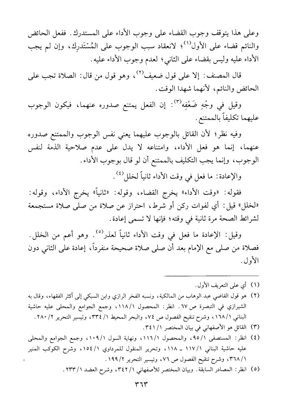 وعلى هذا يتوقف وجوب القضاء على وجوب الأداء على المستدرك. ففعل الحائض والنائم قضاء على الأول؛ لانعقاد سبب الوجوب على المُسْتَدرِك، وإن لم يجب الأداء عليه وليس بقضاء على الثاني؛ لعدم وجوب الأداء عليه.