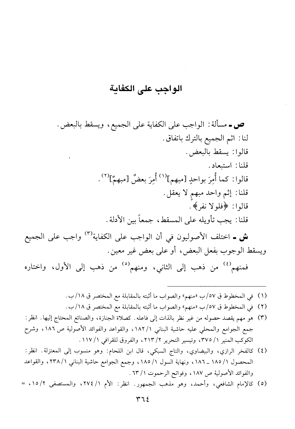 ش ــ اختلف الأصوليون في أن الواجب على الكفاية واجب على الجميع ويسقط الوجوب بفعل البعض، أو على بعض غير معين.