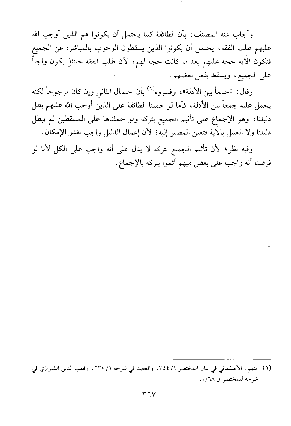 وقال: {{جمعاً بين الأدلة}}، وفسروه بأن احتمال الثاني وإن كان مرجوحاً لكنه يحمل عليه جمعاً بين الأدلة، فأما لو حملنا الطائفة على الذين أوجب الله عليهم بطل دليلنا، وهو الإجماع على تأثيم الجميع بتركه ولو حملناها على المسقطين لم يبطل دليلنا ولا العمل بالآية فتعين المصير إليه؛ لأن إعمال الدليل واجب بقدر الإمكان.