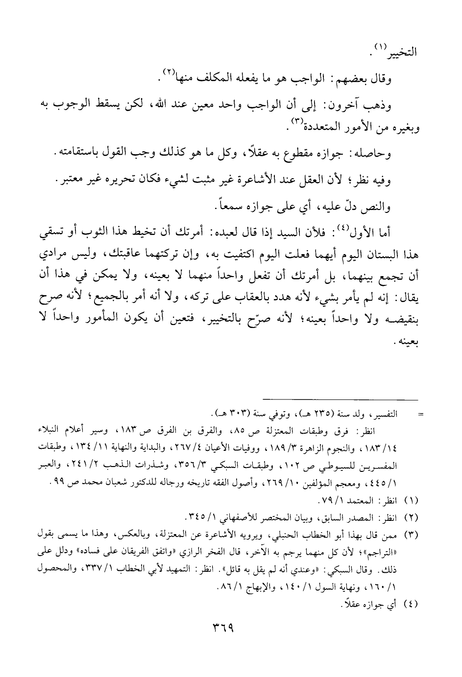 أما الأول: فلأن السيد إذا قال لعبده: أمرتك أن تخيط هذا الثوب أو تسقي هذا البستان اليوم أيهما فعلت اليوم اكتفيت به، وإن تركتهما عاقبتك، وليس مرادي أن تجمع بينهما، بل أمرتك أن تفعل واحداً منهما لا بعينه، ولا يمكن في هذا أن يقال: إنه لم يأمر بشيء لأنه هدد بالعقاب على تركه، ولا أنه أمر بالجميع؛ لأنه صرح بنقيضه ولا واحداً بعينه؛ لأنه صرّح بالتخيير، فتعين أن يكون المأمور واحداً لا بعينه.