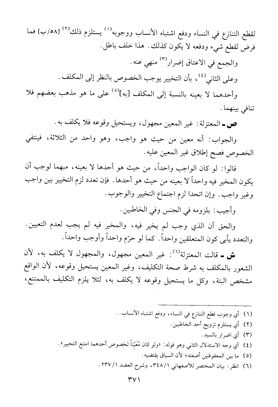 ش ــ قالت المعتزلة: غير المعين مجهول، والمجهول لا يكلف به، لأن الشعور بالمكلف به شرط صحة التكليف، وغير المعين يستحيل وقوعه، لأن الواقع مشخص البتة، وكل ما يستحيل وقوعه لا يكلف به، لئلا يلزم التكليف بالممتنع،