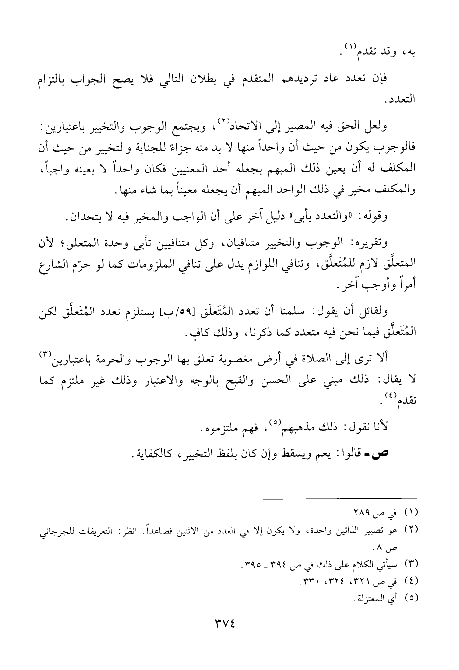 ولقائل أن يقول: سلمنا أن تعدد المُتَعلّق يستلزم تعدد المُتَعلَّق [٥٩/ب] لكن المُتَعلَّق فيما نحن فيه متعدد كما ذكرنا، وذلك كافٍ.