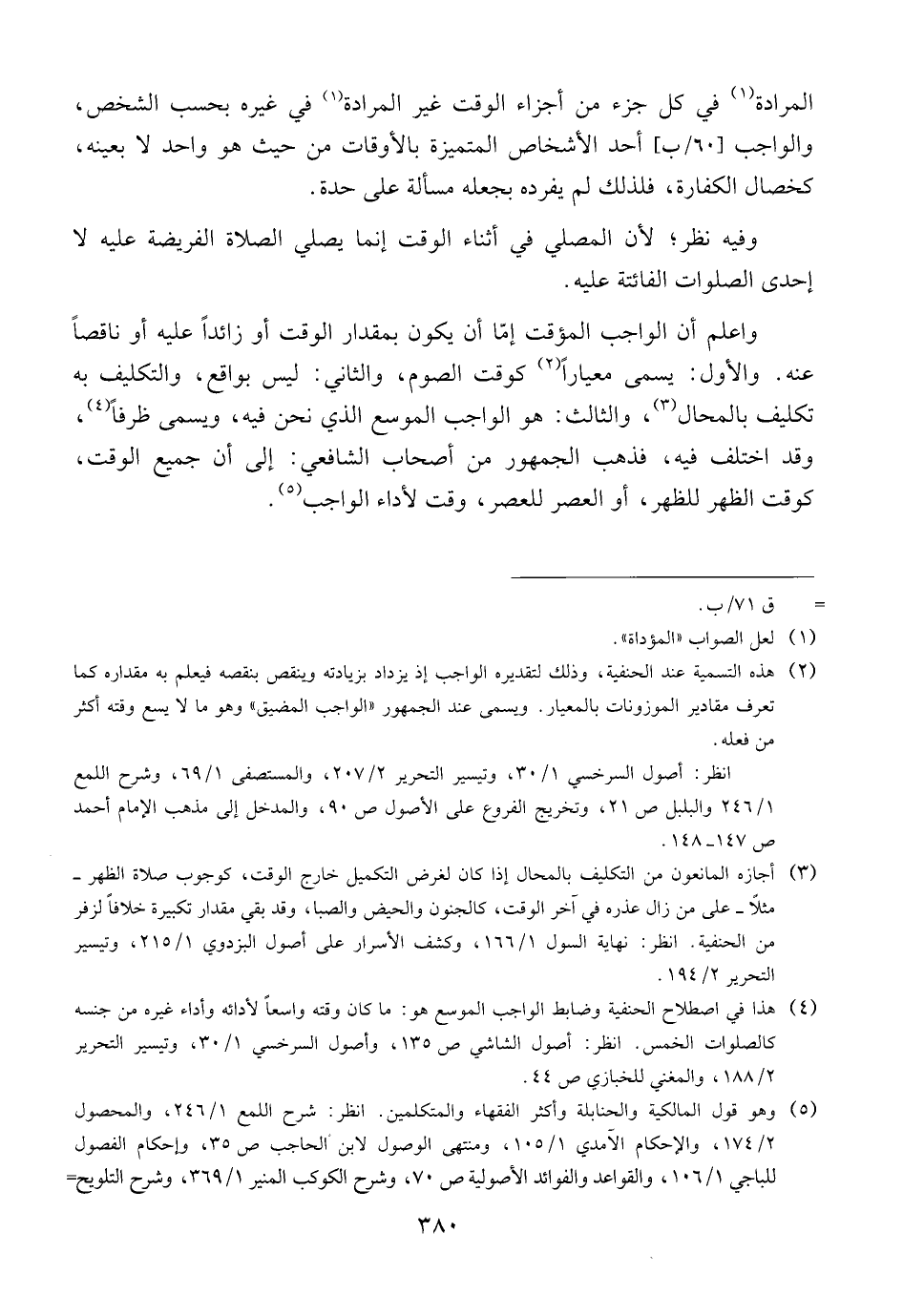 واعلم أن الواجب المؤقت إمّا أن يكون بمقدار الوقت أو زائداً عليه أو ناقصاً عنه. والأول: يسمى معياراً كوقت الصوم، والثاني: ليس بواقع، والتكليف به تكليف بالمحال، والثالث: هو الواجب الموسع الذي نحن فيه، ويسمى ظرفاً، وقد اختلف فيه، فذهب الجمهور من أصحاب الشافعي: إلى أن جميع الوقت، كوقت الظهر للظهر، أو العصر للعصر، وقت لأداء الواجب.