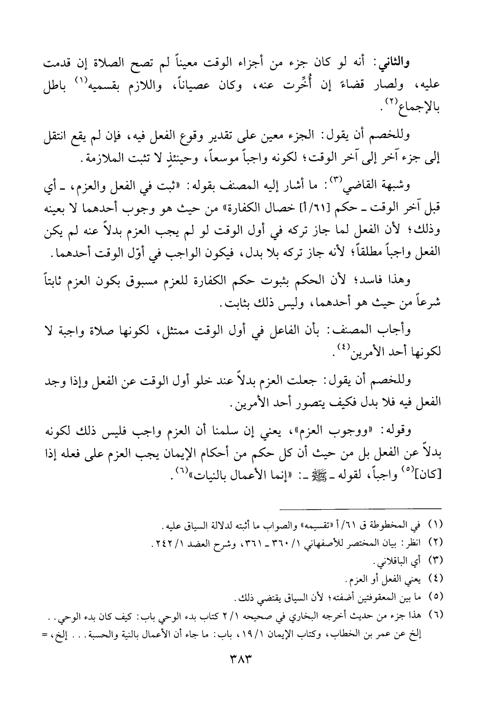 وقوله: {{ووجوب العزم}}، يعني إن سلمنا أن العزم واجب فليس ذلك لكونه بدلاً عن الفعل بل من حيث أن كل حكم من أحكام الإيمان فيجب العزم على فعله إذا [كان] واجباً، لقوله ــ صلى الله عليه وسلم ــ: {{إنما الأعمال بالنيات}}.