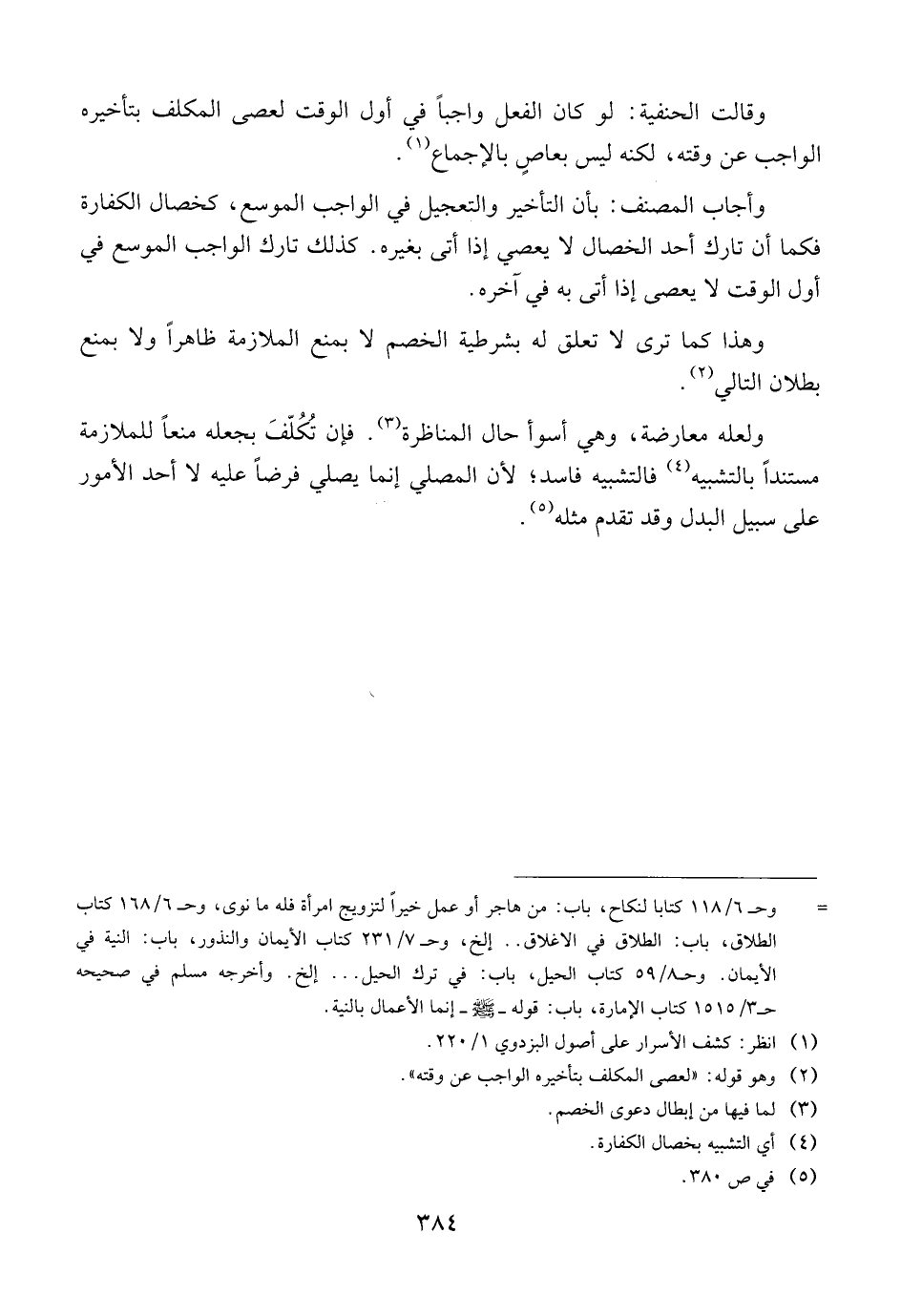 وأجاب المصنف: بأن التأخير والتعجيل في الواجب الموسع، كخصال الكفارة فكما أن تارك أحد الخصال لا يعصى إذا أتى بغيره. كذلك تارك الواجب الموسع في أول الوقت لا يعصى إذا أتى به في آخره.