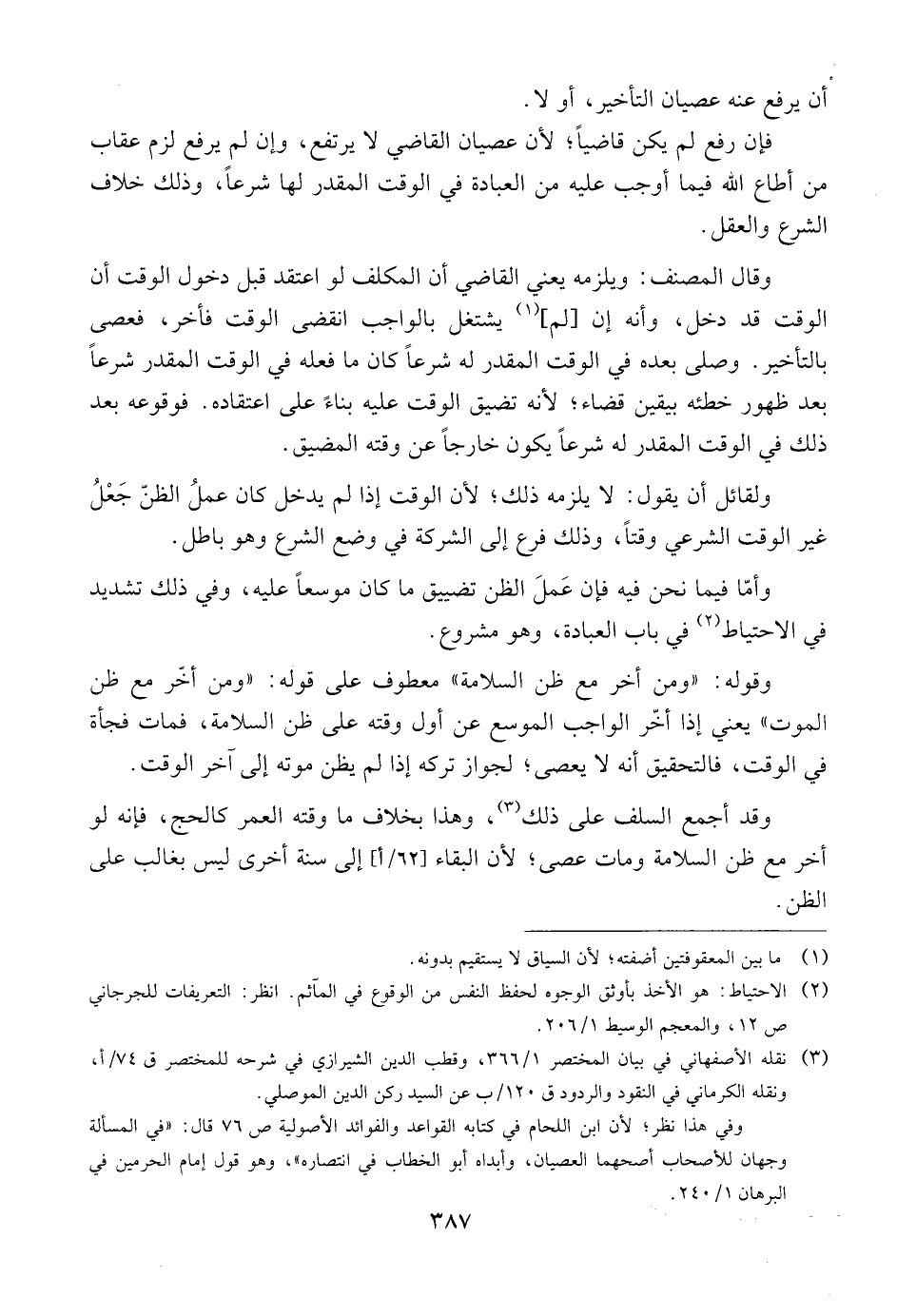 وقال المصنف: ويلزمه يعني القاضي أن المكلف لو اعتقد قبل دخول الوقت أن الوقت قد دخل، وأنه إن [لم] يشتغل بالواجب انقضى الوقت فأخر، فعصى بالتأخير. وصلى بعده في الوقت المقدر له شرعاً كان ما فعله في الوقت المقدر شرعاً بعد ظهور خطئه بيقين قضاء؛ لأنه تضيق الوقت عليه بناءً على اعتقاده. فوقوعه بعد ذلك في الوقت المقدر له شرعاً يكون خارجاً عن وقته المضيق.