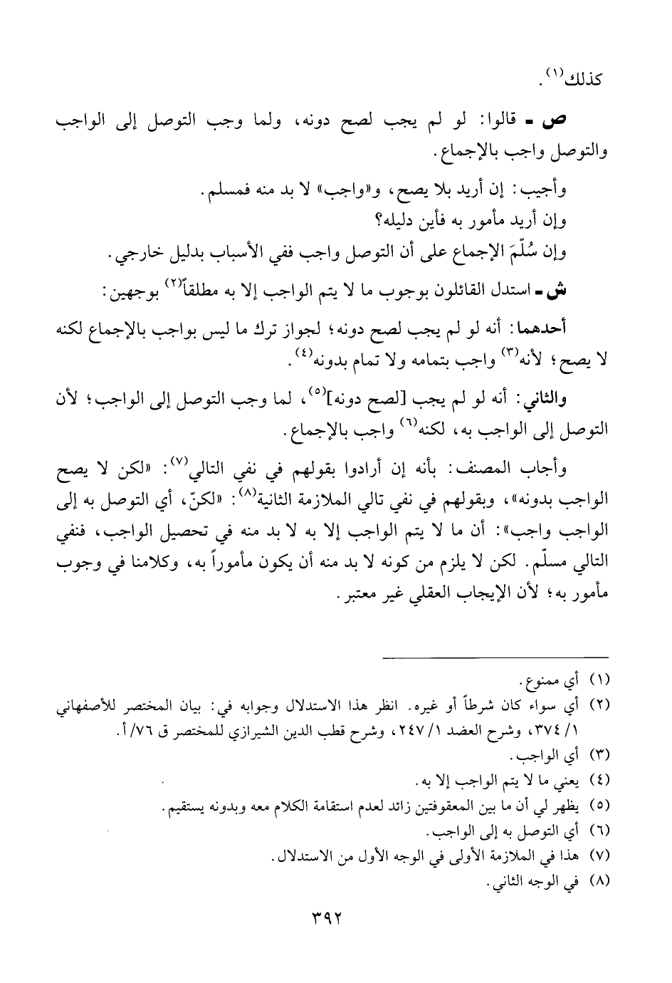 وأجاب المصنف: بأنه إن أرادوا بقولهم في نفي التالي: {{لكن لا يصح الواجب بدونه}}، وبقولهم في نفي تالي الملازمة الثانية: {{لكنّ، أي التوصل به إلى الواجب واجب}}: أن ما لا يتم الواجب إلا به لا بد منه في تحصيل الواجب، فنفي التالي مسلّم. لكن لا يلزم من كونه لا بد منه أن يكون مأموراً به، وكلامنا في وجوب مأمور به؛ لأن الإيجاب العقلي غير معتبر.