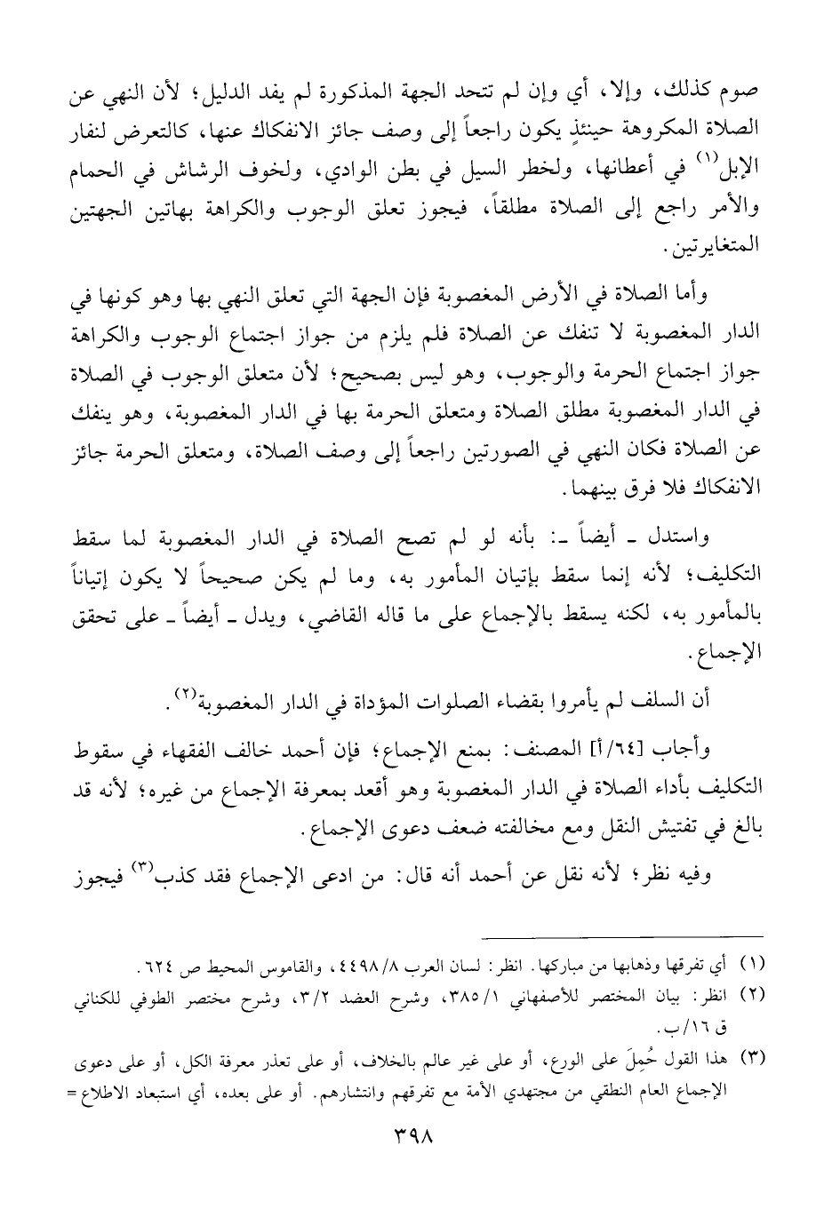 وأجاب [٦٤/أ] المصنف: بمنع الإجماع؛ فإن أحمد خالف الفقهاء في سقوط التكليف بأداء الصلاة في الدار المغصوبة وهو أقعد بمعرفة الإجماع من غيره؛ لأنه قد بالغ في تفتيش النقل ومع مخالفته ضعف دعوى الإجماع.