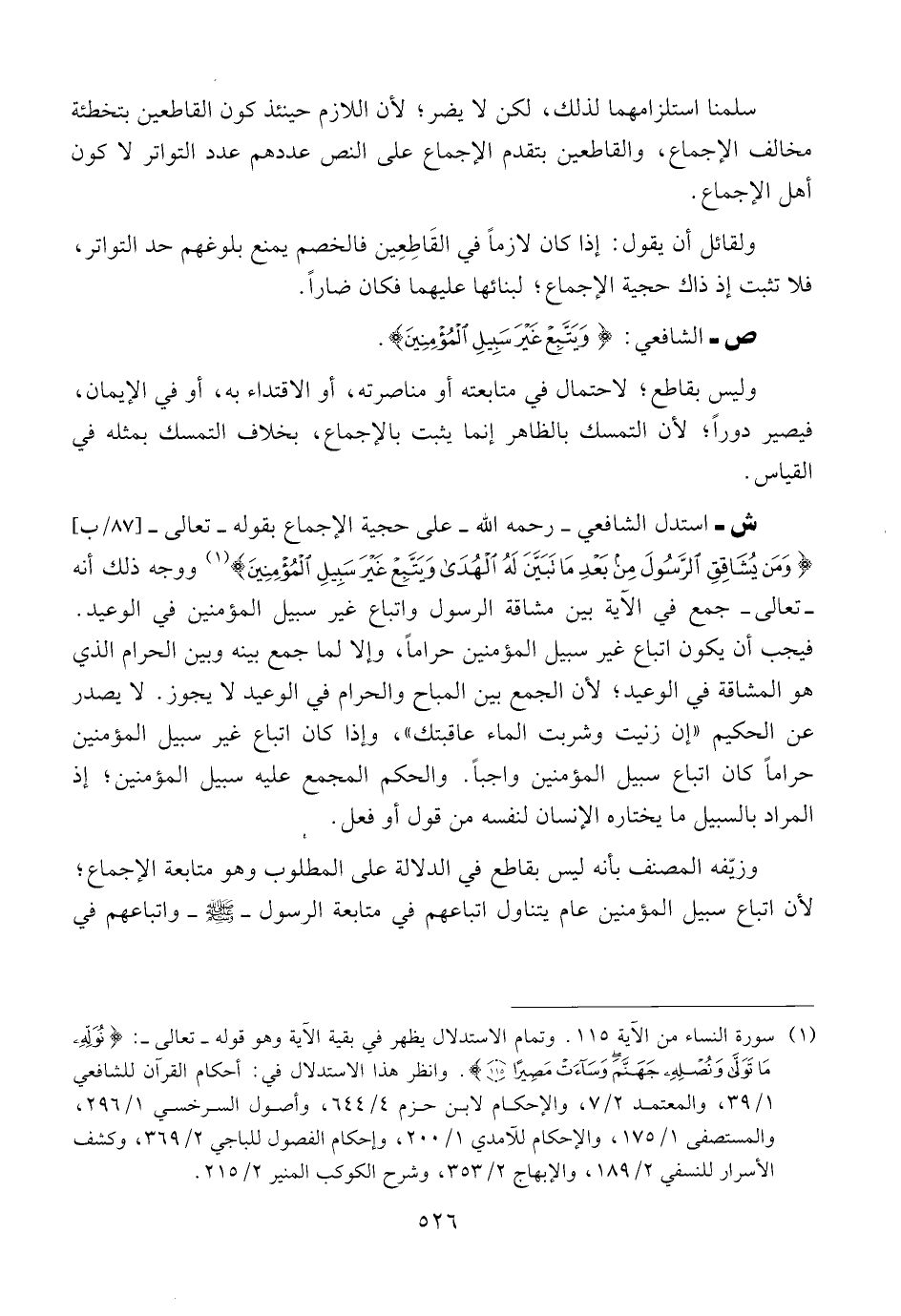 ش ــ استدل الشافعي ــ رحمه الله ــ على حجية الإجماع بقوله ــ تعالى ــ {وَمَن يُشَاقِقِ الرَّسُولَ مِن بَعدِمَاتَبَيَّنَلَهُالهُدَى وَيَتَّبِع غَيرَسَبِيلِ المُؤمِنِينَ} ووجه ذلك أنه ــ تعالى ــ جمع في الآية بين مشاقة الرسول واتباع غير سبيل المؤمنين في الوعيد. فيجب أن يكون اتباع غير سبيل المؤمنين حراماً، وإلا لما جمع بينه وبين الحرام الذي هو المشاقة في الوعيد؛ لأن الجمع بين المباح والحرام في الوعيد لا يجوز. لا يصدر عن الحكيم {{إن زنيت وشربت الماء عاقبتك}}، وإذا كان اتباع غير سبيل المؤمنين حراماً كان اتباع سبيل المؤمنين واجباً. والحكم المجمع عليه سبيل المؤمنين؛ إذ المراد بالسبيل ما يختاره الإنسان لنفسه من قول أو فعل.