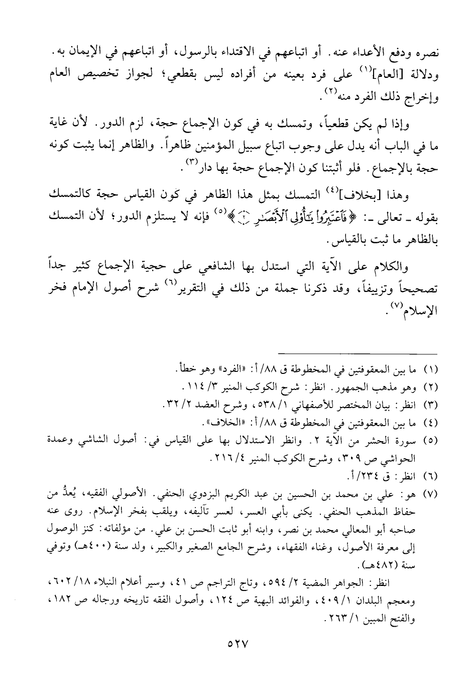 وهذا [بخلاف] التمسك بمثل هذا الظاهر في كون القياس حجة كالتمسك بقوله ــ تعالى ــ {فَاعتَبِرُوايَاأُوْلِيالأَبصَارِ (٢)} فإنه يستلزم الدور؛ لأن التمسك بالظاهر ما ثبت بالقياس.