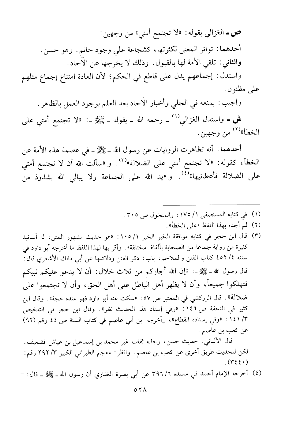 ص ــ الغزالي بقوله: {{لا تجتمع أمتي}} من وجهين: