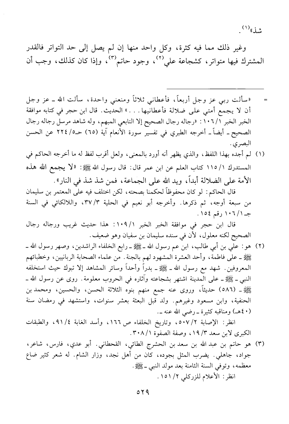وغير ذلك مما فيه كثرة، وكل واحد منها إن لم يصل إلى حد التواتر فالقدر المشترك فيها متواتر، كشجاعة علي، وجود حاتم، وإذا كان كذلك، وجب أن