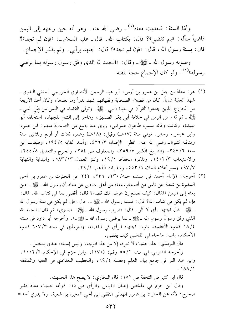 وأمّا السنة: فحديث معاذ ــ رضي الله عنه ــ وهو أنه حين وجهه إلى اليمن قاضياً سأله: {{بم تقضي}}؟ قال: بكتاب الله. قال ــ عليه السلام ــ: {{فإن لم تجد}}؟ قال: بسنة رسول الله، قال: {{فإن لم تجد}}؟ قال: اجتهد برأيي. ولم يذكر الإجماع.