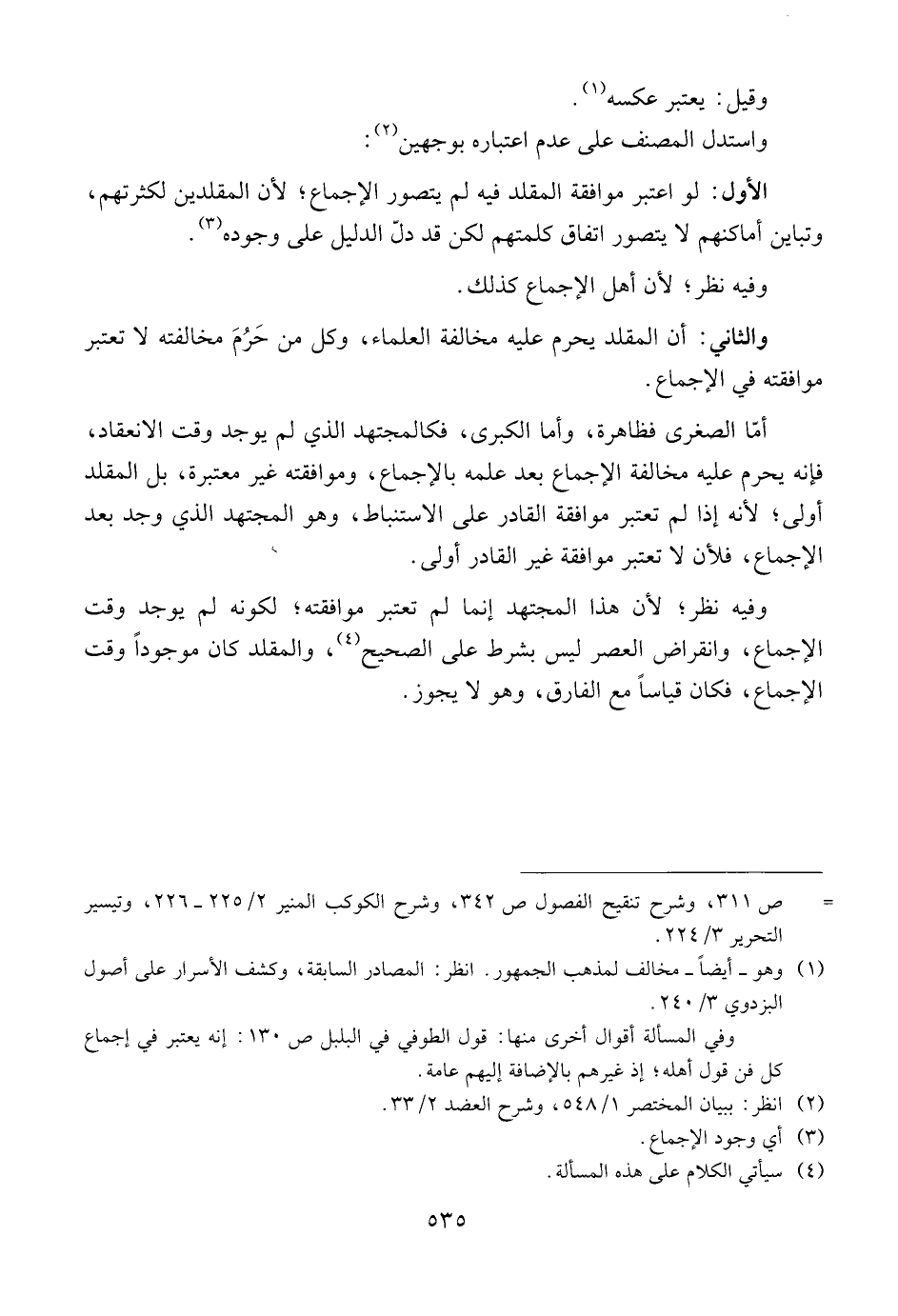 وفيه نظر؛ لأن هذا المجتهد إنما لم تعتبر موافقته؛ لكونه لم يوجد وقت الإجماع، وانقراض العصر ليس بشرط على الصحيح، والمقلد كان موجوداً وقت الإجماع، فكان قياساً مع الفارق، وهو لا يجوز.