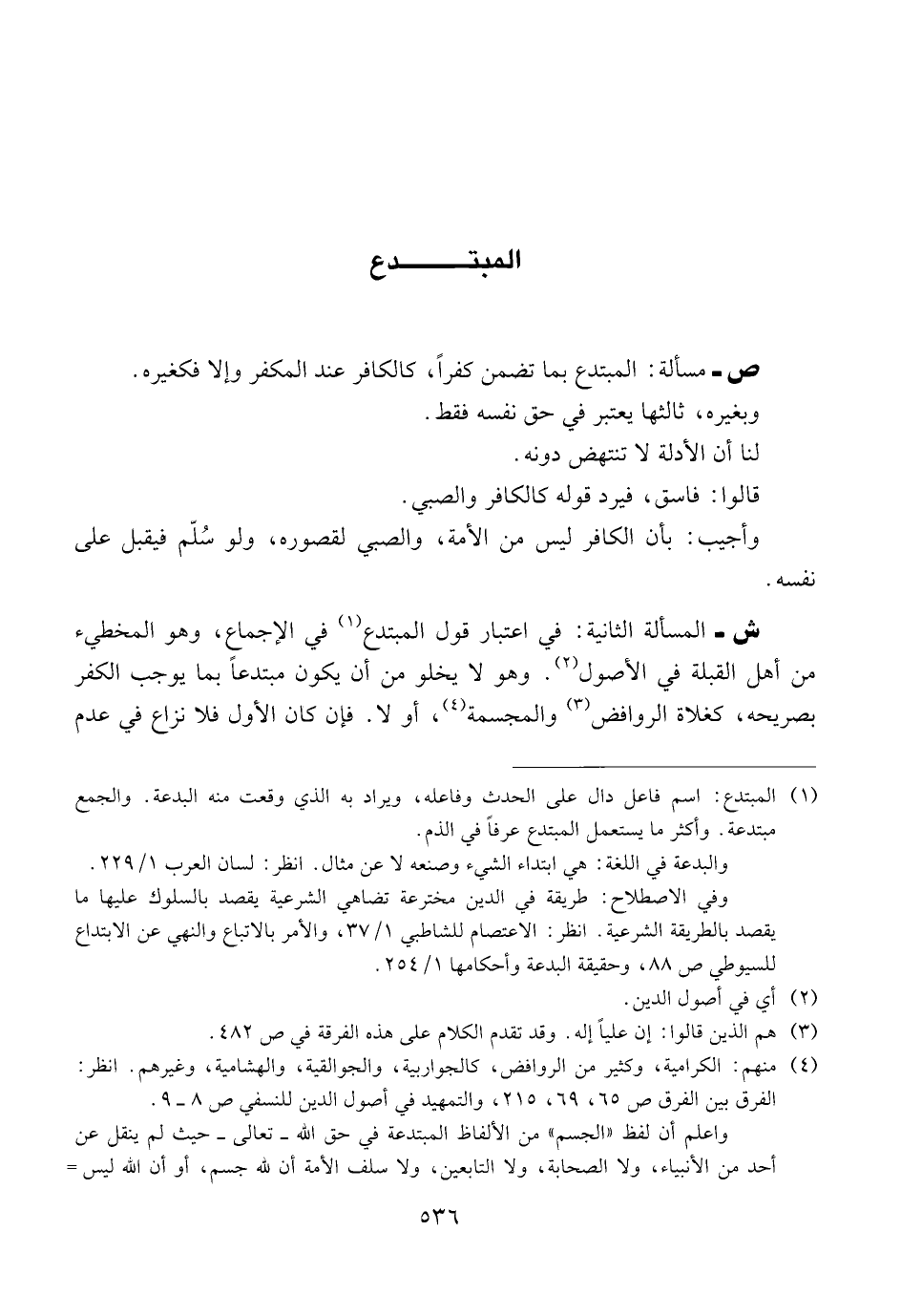 ش ــ المسألة الثانية: في اعتبار قول المبتدع في الإجماع، وهو المخطئ من أهل القبلة في الأصول. وهو لا يخلو من أن يكون مبتدعاً بما يوجب الكفر بصريحه، كغلاة الروافض والمجسمة، أو لا. فإن كان الأول فلا نزاع في عدم