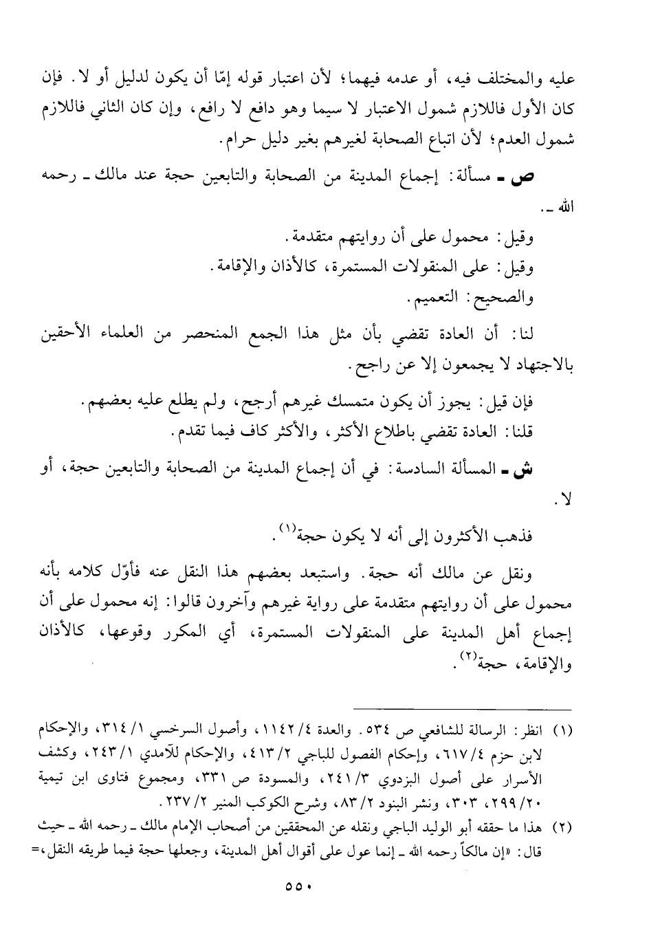 ص ــ مسألة: إجماع المدينة من الصحابة والتابعين حجة عند مالك ــ رحمه الله ــ.