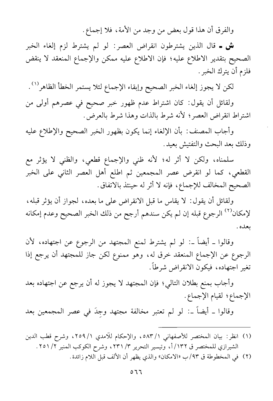 ش ــ قال الذين يشترطون انقراض العصر: لو لم يشترط لزم إلغاء الخبر الصحيح بتقدير الاطلاع عليه؛ فإن الاطلاع عليه ممكن والإجماع المنعقد لا ينقض فلزم أن يترك الخبر.