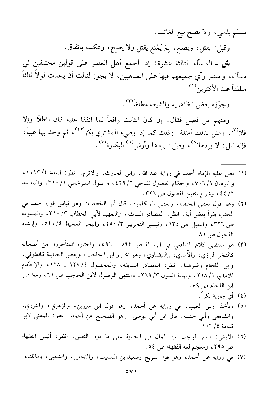 ش ــ المسألة الثالثة عشرة: إذا أجمع أهل العصر على قولين مختلفين في مسألة، واستقر رأي جميعهم فيها على المذهبين، لا يجوز لثالث أن يحدث قولاً ثالثاً مطلقاً عند الأكثرين.