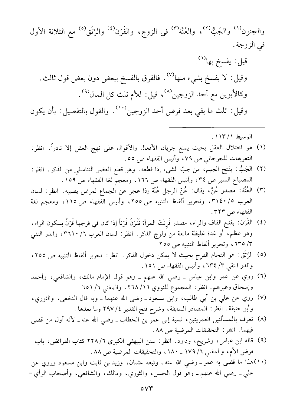 والجنون، والجَبُّ، والعُنَّة في الزوج، والقَرَن والرَّتَق مع الثلاثة الأول في الزوجة.