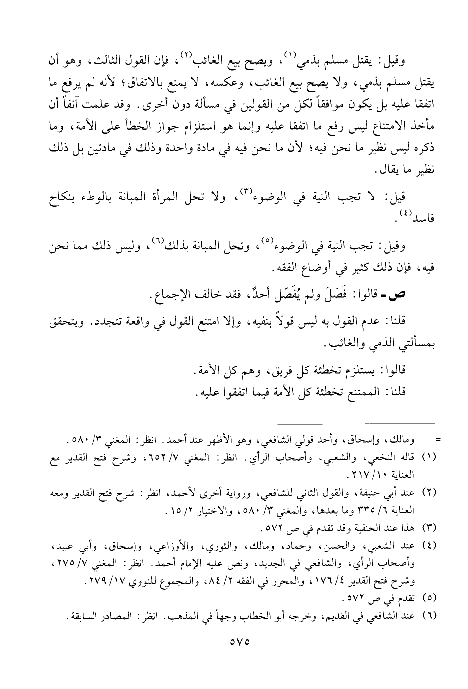 وقيل: يقتل مسلم بذمي، ويصح بيع الغائب، فإن القول الثالث، وهو أن يقتل مسلم بذمي، ولا يصح بيع الغائب، وعكسه، لا يمنع بالاتفاق؛ لأنه لم يرفع ما اتفقا عليه بل يكون موافقاً لكل من القولين في مسألة دون أخرى. وقد علمت آنفاً أن مأخذ الامتناع ليس رفع ما اتفقا عليه وإنما هو استلزام جواز الخطأ على الأمة، وما ذكره ليس نظير ما نحن فيه؛ لأن ما نحن فيه في مادة واحدة وذلك في مادتين بل ذلك نظير ما يقال.