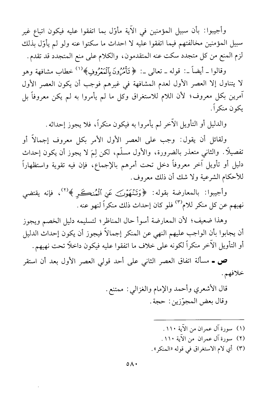 ولقائل أن يقول: وجب على العصر الأول الأمر بكل معروف إجمالاً أو تفصيلاً. والثاني متعذر بالضرورة، والأول مسلّم، لكن لِمَ لا يجوز أن يكون إحداث دليل أو تأويل آخر معروفاً داخل تحت أمرهم بالإجماع، فإن فيه تقوية واستظهاراً للأحكام الشرعية ولا شك أن ذلك معروف.