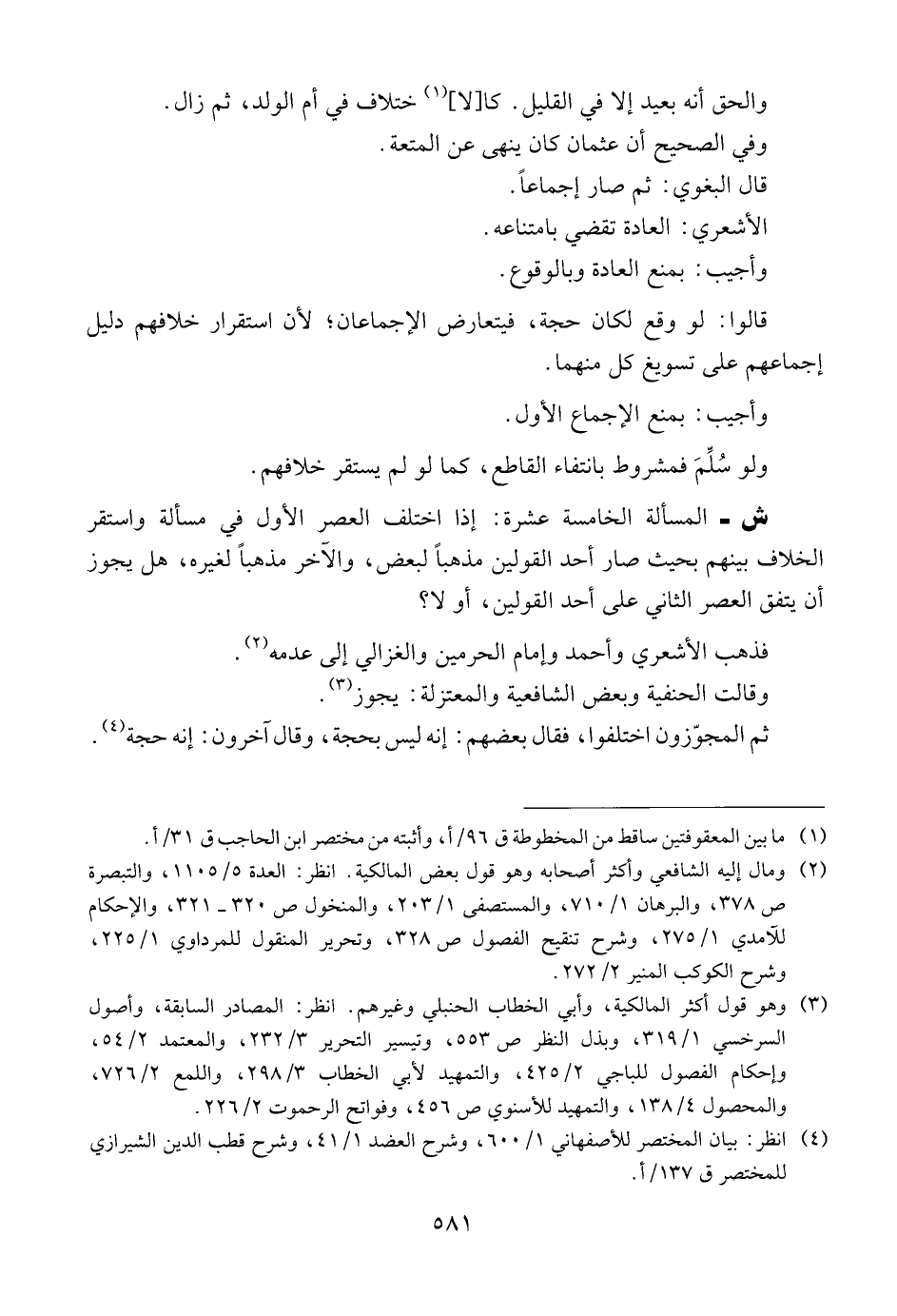 ش ــ المسألة الخامسة عشرة: إذا اختلف العصر الأول في مسألة واستقر الخلاف بينهم بحيث صار أحد القولين مذهباً لبعض، والآخر مذهباً لغيره، هل يجوز أن يتفق العصر الثاني على أحد القولين، أو لا؟