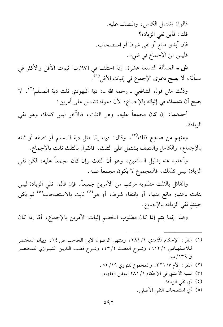 ش ــ المسألة التاسعة عشرة: إذا اختلف في [٩٧/ب] ثبوت الأقل والأكثر في مسألة، لا يصح دعوى الإجماع في إثبات الأقل.