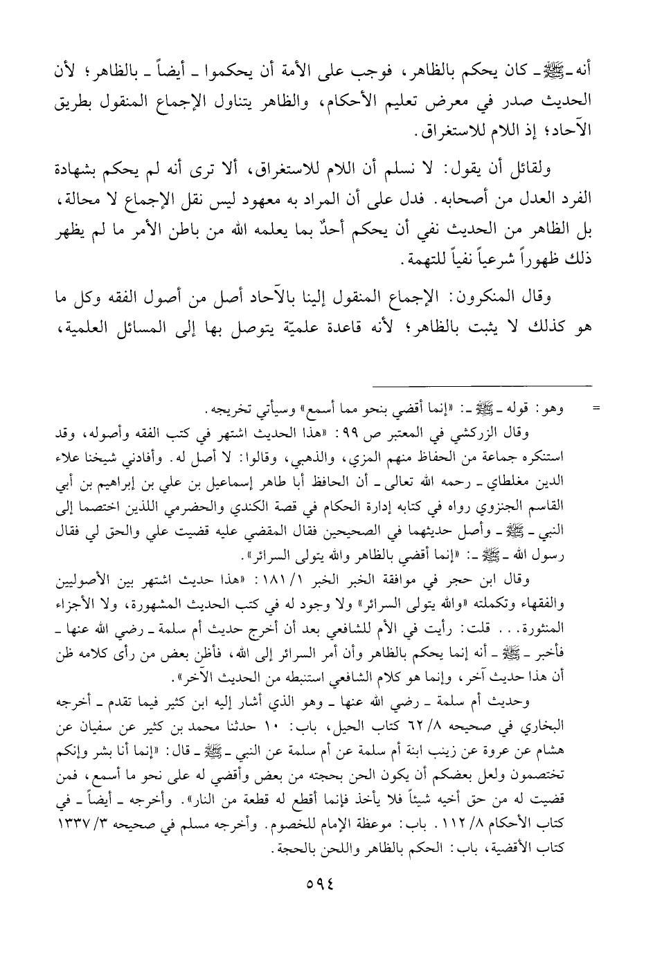 أنه ــ صلى الله عليه وسلم ــ أنه يحكم بالظاهر، فوجب على الأمة أن يحكموا ــ أيضاً ــ بالظاهر؛ لأن الحديث صدر في معرض تعليم الأحكام، والظاهر يتناول الإجماع المنقول بطريق الآحاد؛ إذ اللام للاستغراق.