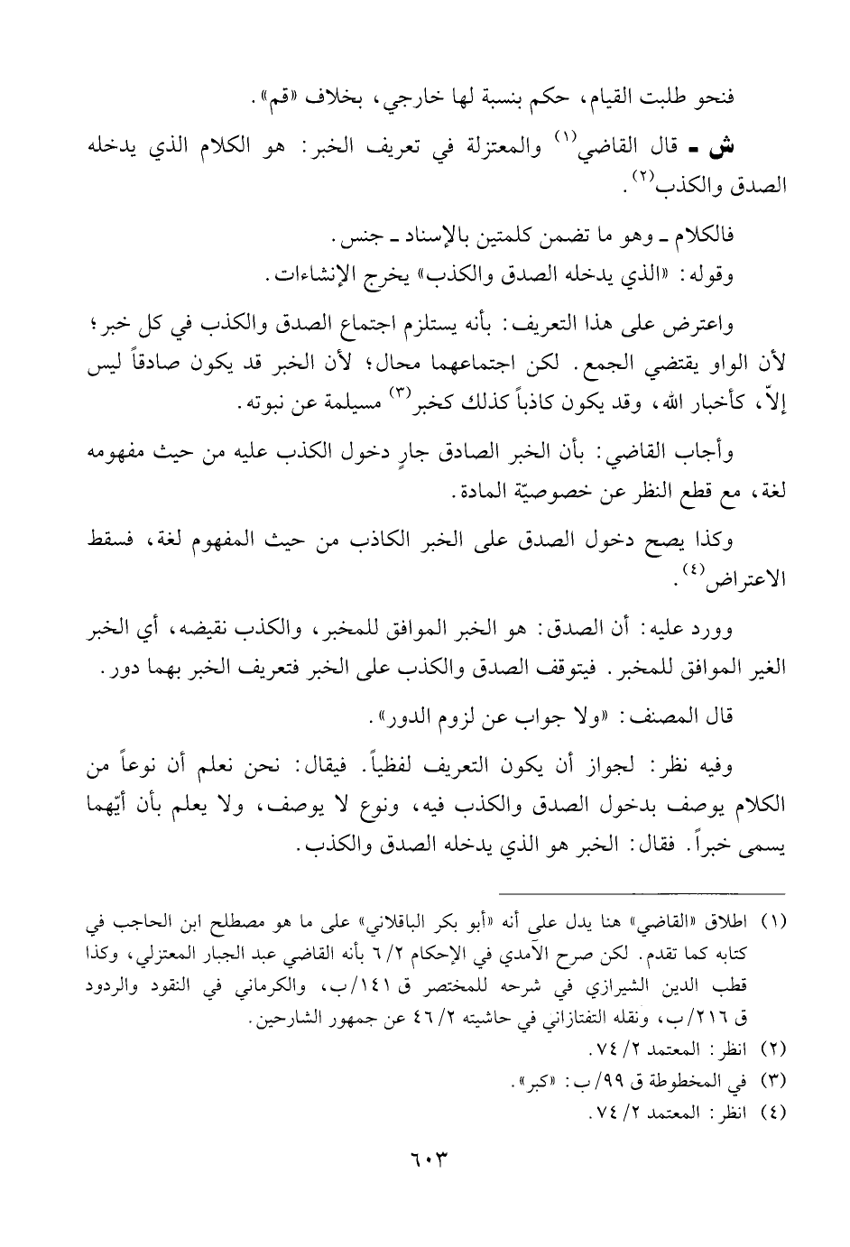 ش - قال القاضي والمعتزلة في تعريف الخبر: هو الكلام الذي يدخله الصدق والكذب.
