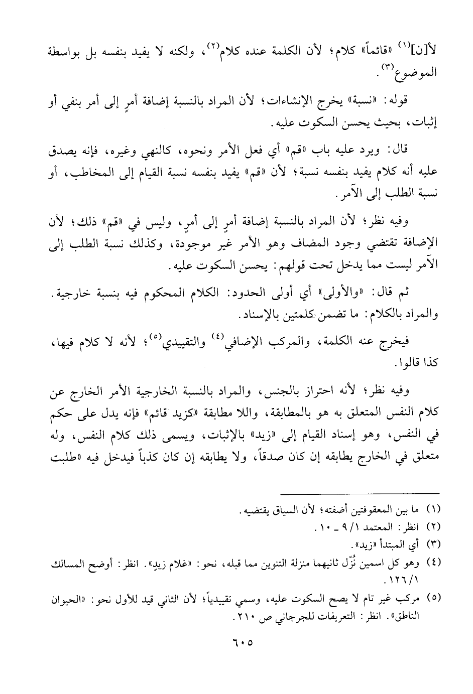 وفيه نظر؛ لأن المراد بالنسبة إضافة أمرٍ إلى أمرٍ، وليس في {{قم}} ذلك؛ لأن الإضافة تقتضي وجود المضاف وهو الأمر غير موجودة، وكذلك نسبة الطلب إلى الآمر ليست مما يدخل تحت قولهم: يحسن السكوت عليه.
