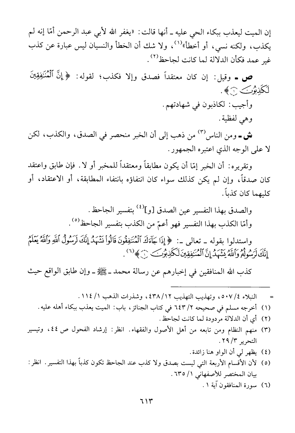 ش ــ ومن الناس من ذهب إلى أن الخبر منحصر في الصدق، والكذب، لكن لا على الوجه الذي اعتبره الجمهور.