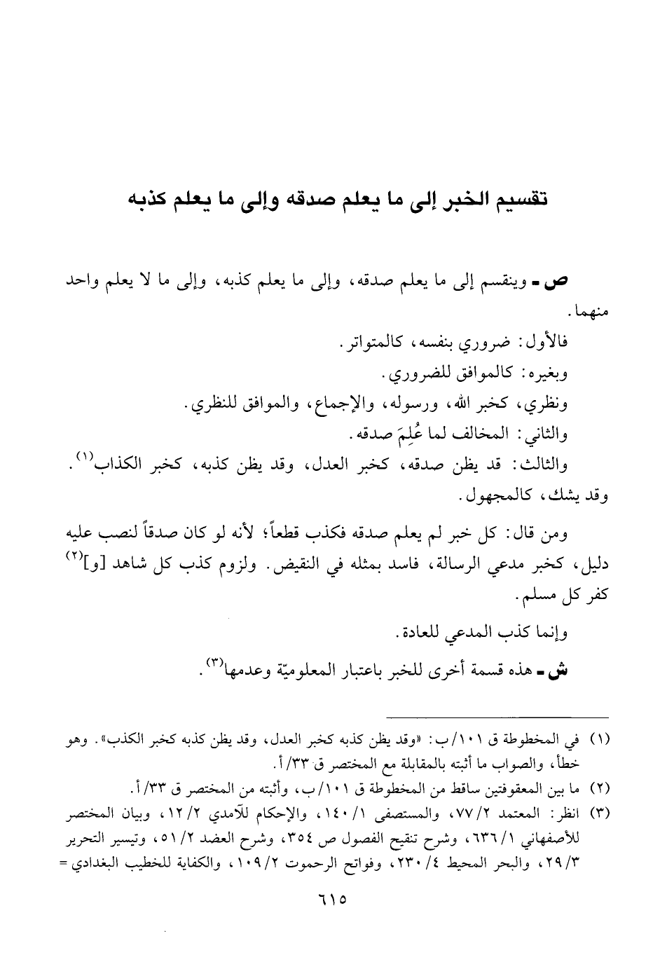 ص ــ وينقسم إلى ما يعلم صدقه، وإلى ما يعلم كذبه، وإلى ما لا يعلم واحد منهما.
