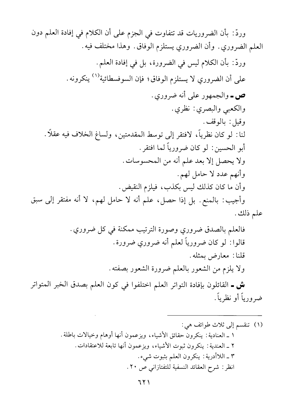ش ــ القائلون بإفادة التواتر العلم اختلفوا في كون العلم بصدق الخبر المتواتر ضرورياً أو نظرياً.