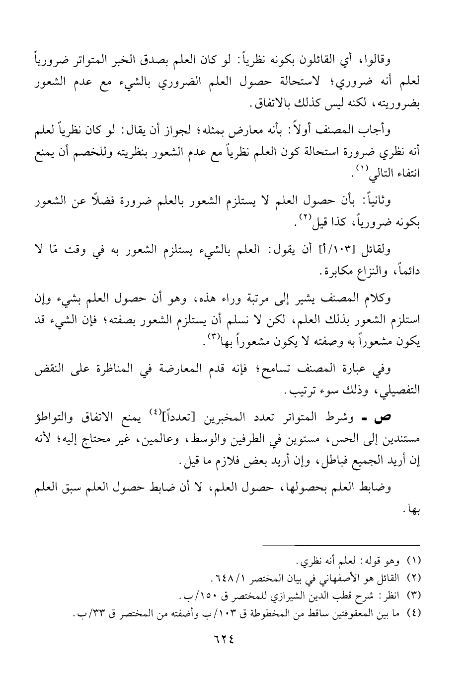 ص ــ وشرط المتواتر تعدد المخبرين [تعدداً] يمنع الاتفاق والتواطؤ مستندين الحس، مستوين في الطرفين والوسط، وعالمين، غير محتاج إليه؛ لأنه إن أريد الجميع فباطل، وإن أريد بعض فلازم ما قيل.