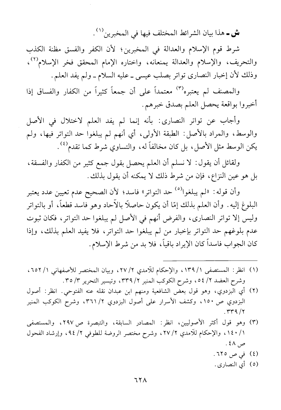 شرط قوم الإسلام والعدالة في المخبرين؛ لأن الكفر والفسق مظنة الكذب والتحريف، والإسلام والعدالة يمنعانه، واختاره الإمام المحقق فخر الإسلام، وذلك لأن إخبار النصارى تواتر بصلب عيسى ــ عليه السلام ــ ولم يفد العلم.