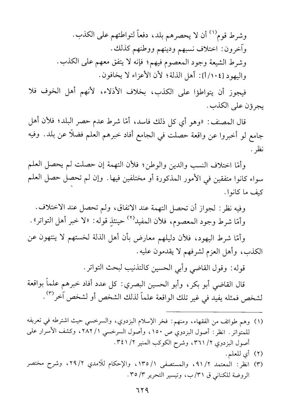 وشرط الشيعة وجود المعصوم فيهم؛ فإنه لا يتفق معهم على الكذب.